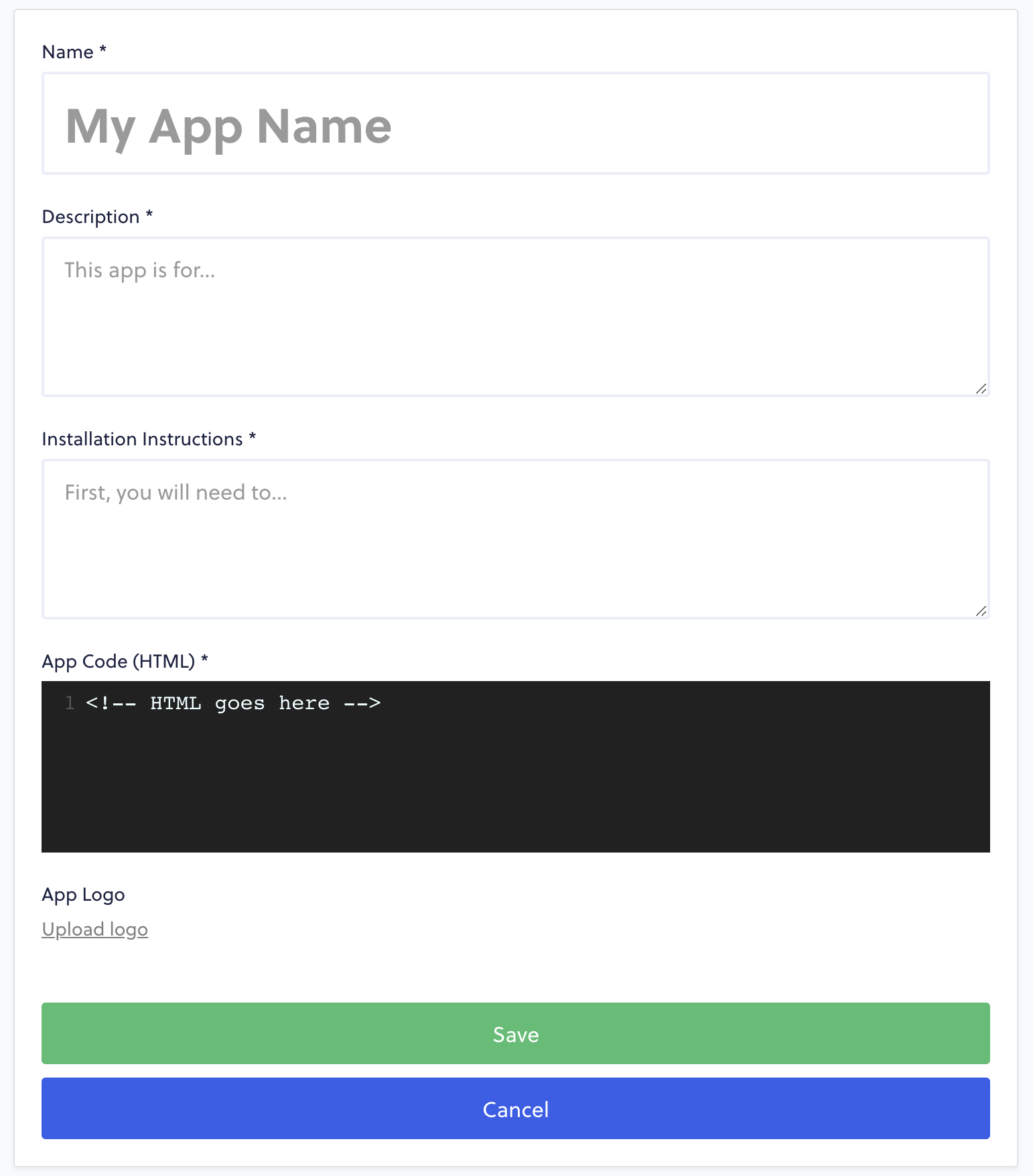 The App Code section is where you will place your HTML, JavaScript, or even CSS for your app. Just keep in mind that this field expects HTML, so if you're planning on writing CSS and JS inside of this editor, you'll need to wrap it in <style> and <script> tags, respectively.